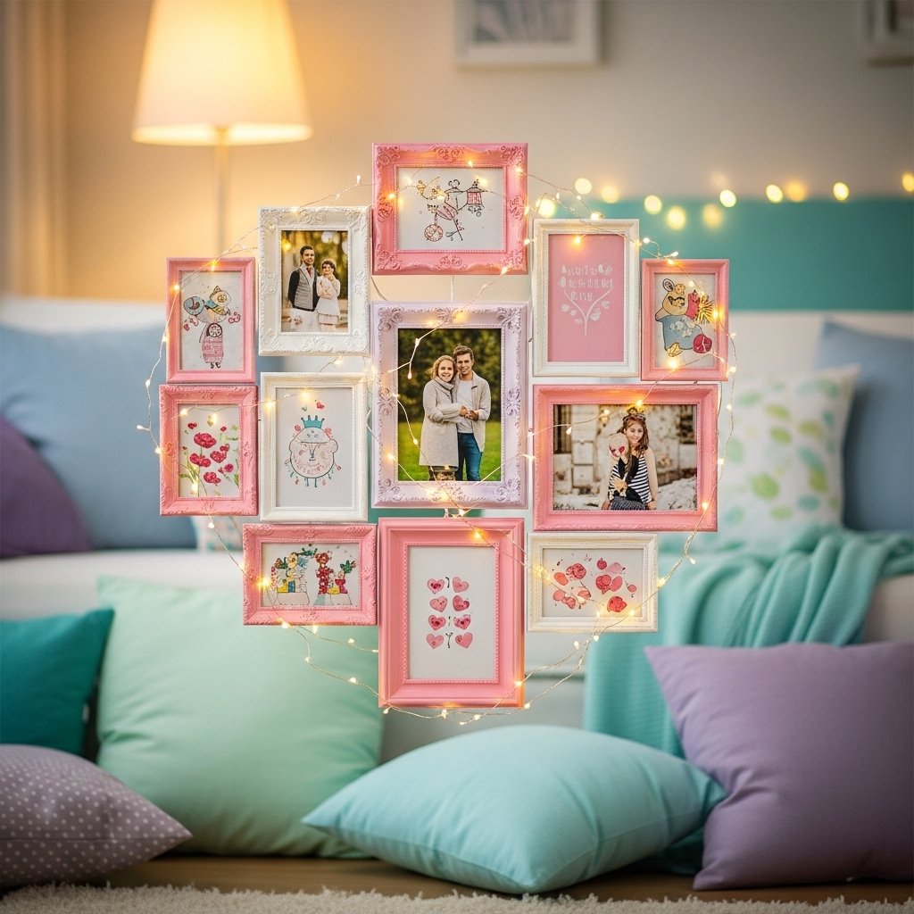 String lights combined with a photo collage add warmth and a cozy glow to your living room. Hang pink and white frames on the wall, then weave fairy lights through the frames or around the edges. This creates a whimsical and inviting ambiance, ideal for evening relaxation or intimate gatherings. The lights also draw attention to the wall decor without overwhelming the space. This idea works particularly well for soft, pastel-themed living rooms.