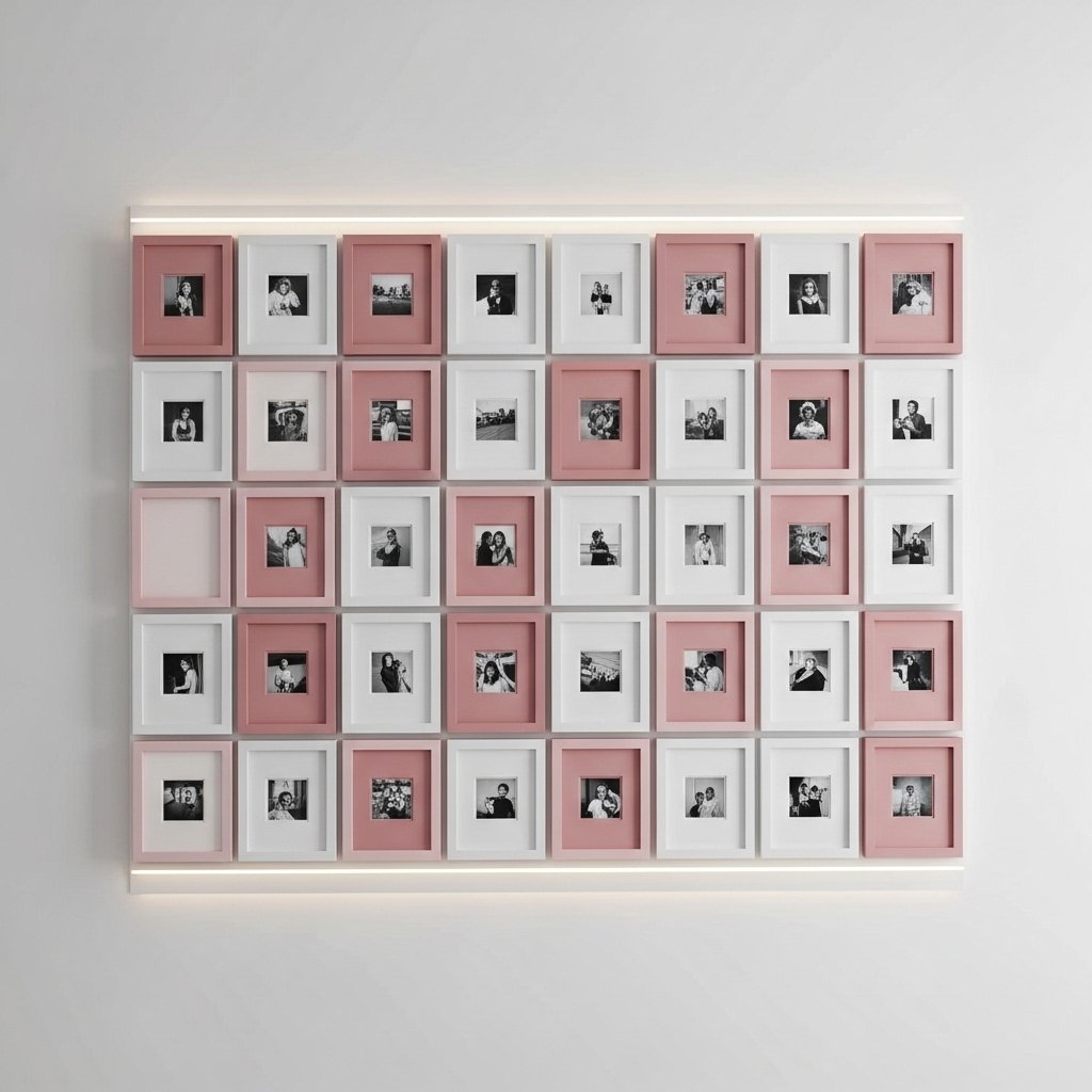 A minimalist photo grid is perfect for creating a clean and organized look. Arrange square or rectangular frames in a uniform pattern with alternating pink and white borders. Black-and-white photos with soft pink accents complement this style beautifully. The grid design keeps the wall neat while allowing each photo to stand out individually. Adding small, subtle decor items like floating shelves or LED strips enhances the modern minimalist vibe.