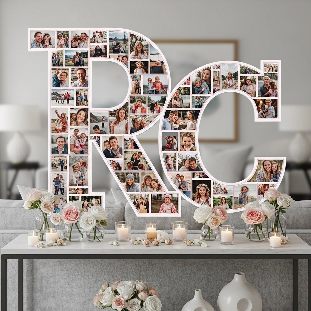 A monogram collage is a personalized wall decor idea that combines photos with your initials or family name. Use pink and white frames to form the shape of the letters or arrange photos around a large central monogram. This design is perfect for adding a personal touch to your living room. Combine with small decorative elements like flowers, candles, or artwork to complete the aesthetic. It’s both unique and meaningful, making your wall instantly memorable.