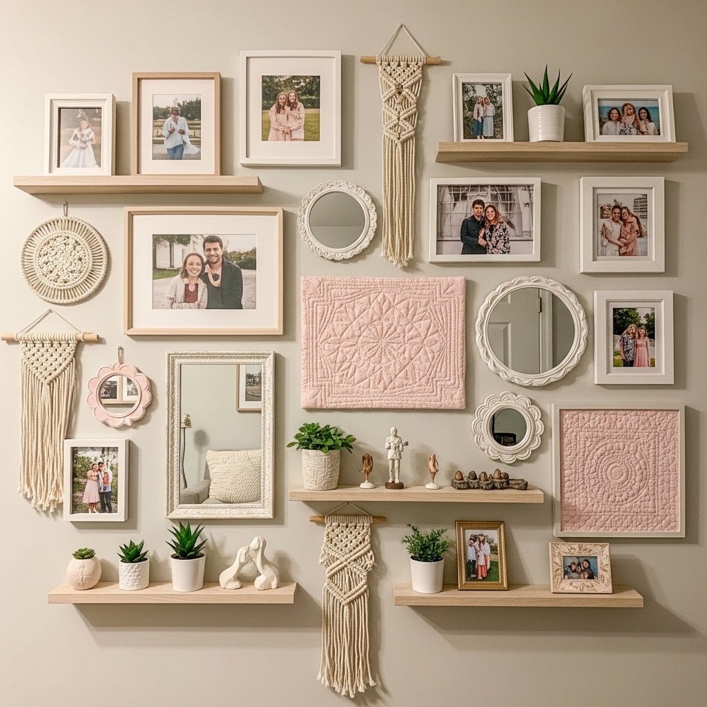 A mixed media photo wall blends traditional frames with other textures and materials. Combine pink and white photo frames with fabric wall hangings, mirrors, or small wooden shelves. This creates a layered, tactile look that feels curated and artistic. Including different textures enhances visual interest while maintaining a soft aesthetic. Mixed media walls are perfect for living rooms that aim for a cozy yet stylish vibe.