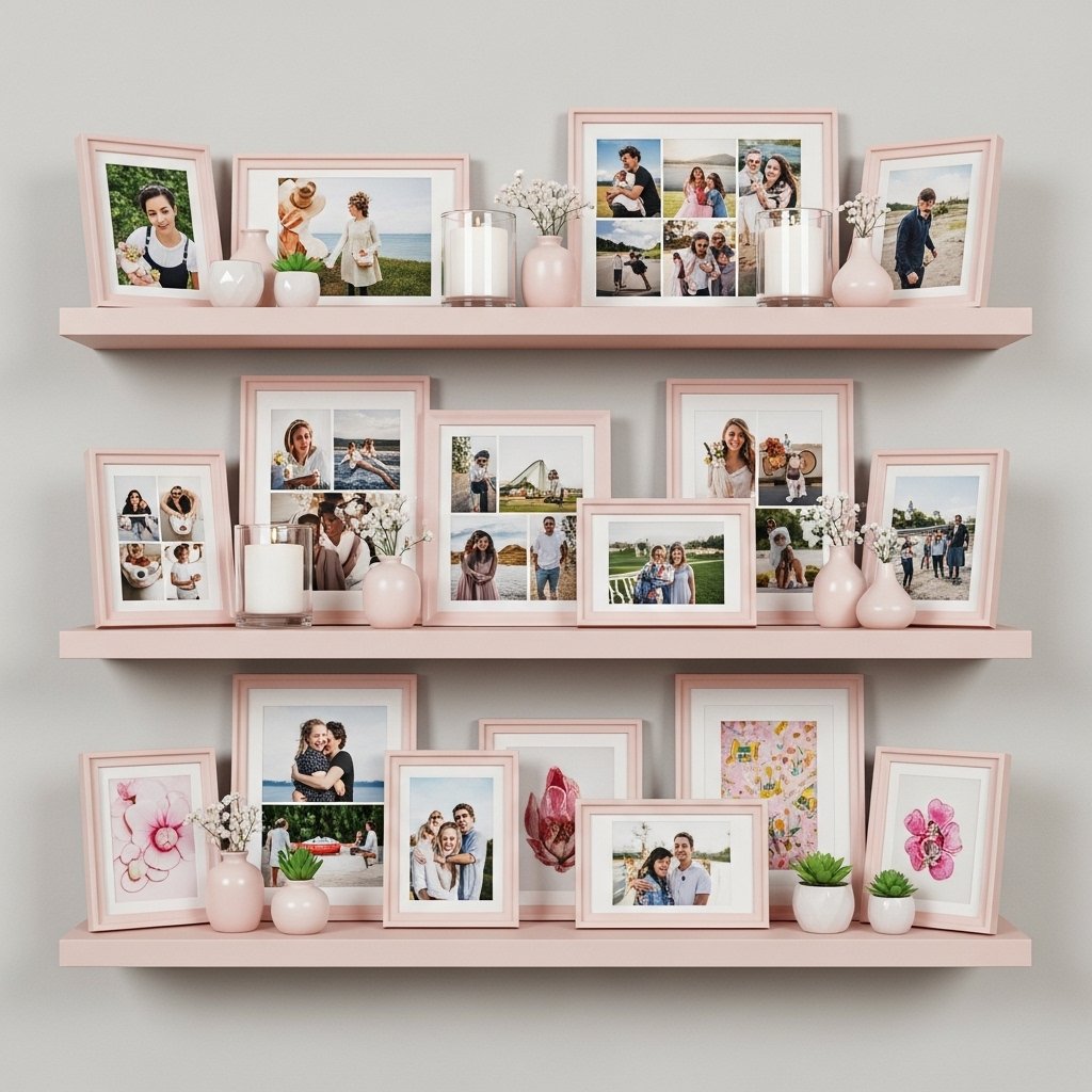 Floating shelves provide both functionality and aesthetic appeal for your living room walls. Place framed photos on shelves, mixing different sizes in soft pink and white frames. You can add small decorative objects such as vases, candles, or plants to create depth and dimension. This approach allows easy updates and rearrangements without damaging the wall. Floating shelves combined with photo collages make the space feel curated yet personal.