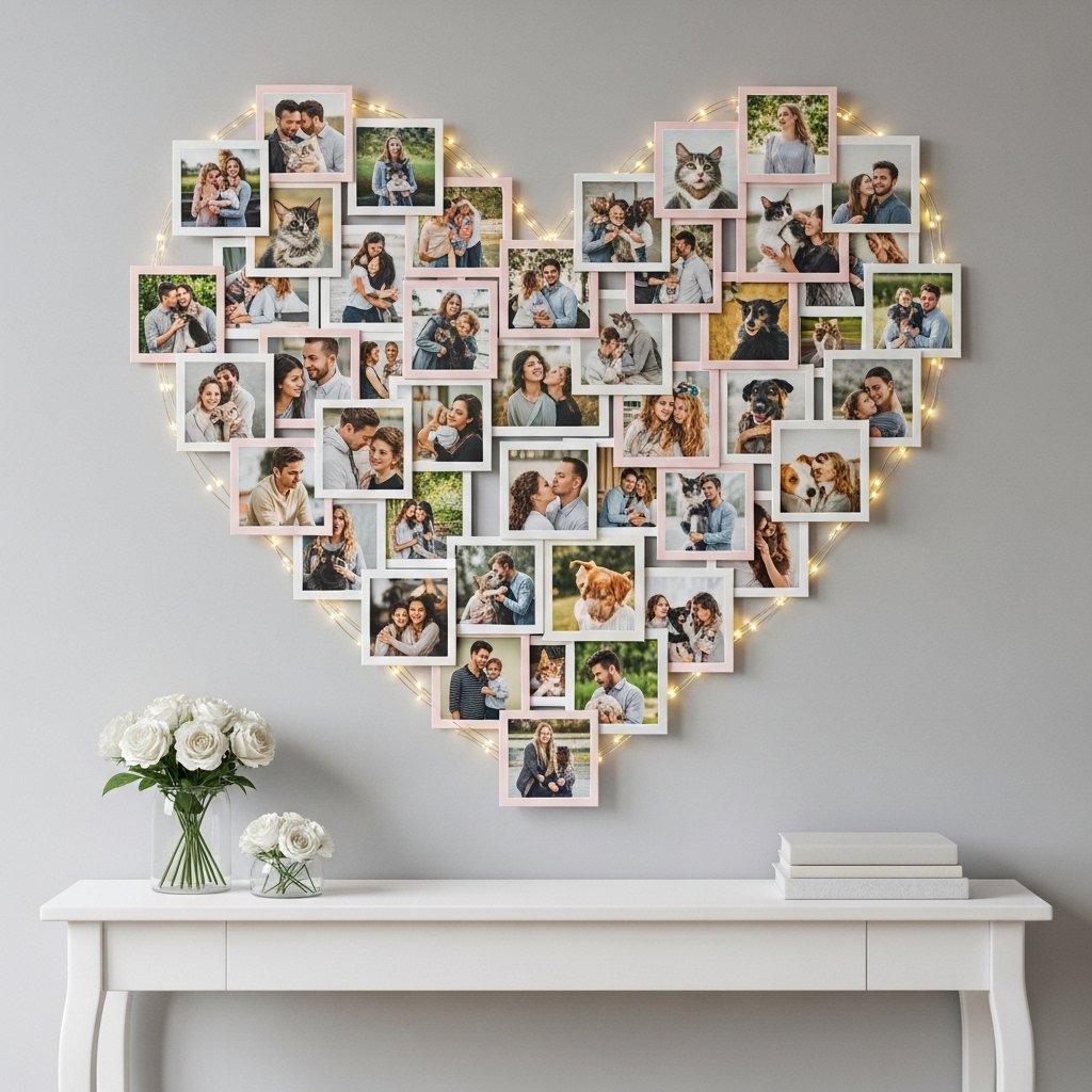 A heart-shaped photo collage is a perfect way to display cherished memories in a visually appealing design. Use pink and white frames or colored cardstock to accentuate the shape. Fill the collage with pictures of family, friends, or special moments to make it meaningful. This layout works beautifully above sofas or side tables as a romantic focal point. Adding soft fairy lights around the heart enhances the cozy and inviting vibe.