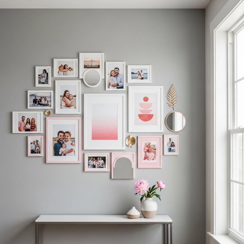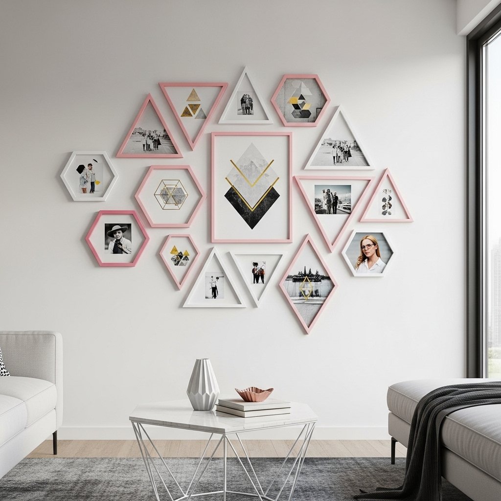 A geometric layout offers a contemporary twist to traditional photo collages. Use triangular, hexagonal, or diamond-shaped frames in pink and white to create visual interest. Mix photos with geometric art prints to maintain balance and cohesion. This layout works well for living rooms with modern furniture and clean lines. The geometric arrangement adds energy without overpowering the pink and white palette.