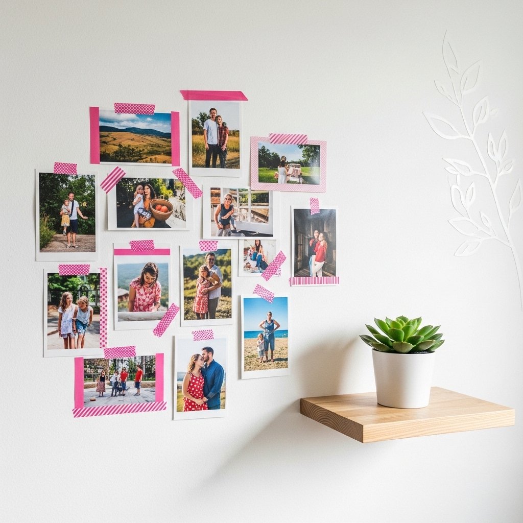 For a budget-friendly and creative option, pink washi tape can frame your photos directly on the wall. Arrange photos in a casual or symmetrical pattern using pink tape as the border. This DIY idea allows frequent updates and is perfect for renters. Pair with white accents like small wall decals or shelves to keep the wall visually appealing. The washi tape collage is both playful and stylish, fitting a soft, aesthetic theme.