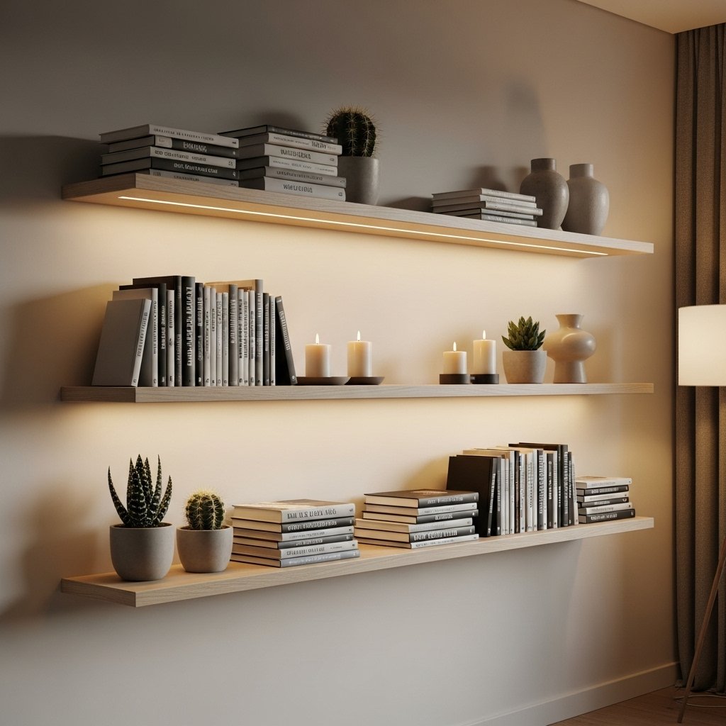 Floating shelves are perfect for showcasing books, small plants, candles, or decorative figurines. These shelves save space while adding visual interest and functionality. You can mix books horizontally and vertically to create depth and variation. This type of DIY wall décor allows you to rotate items seasonally or whenever you feel like refreshing the look. Floating shelves also help organize your living room while keeping it stylish and minimalistic.
