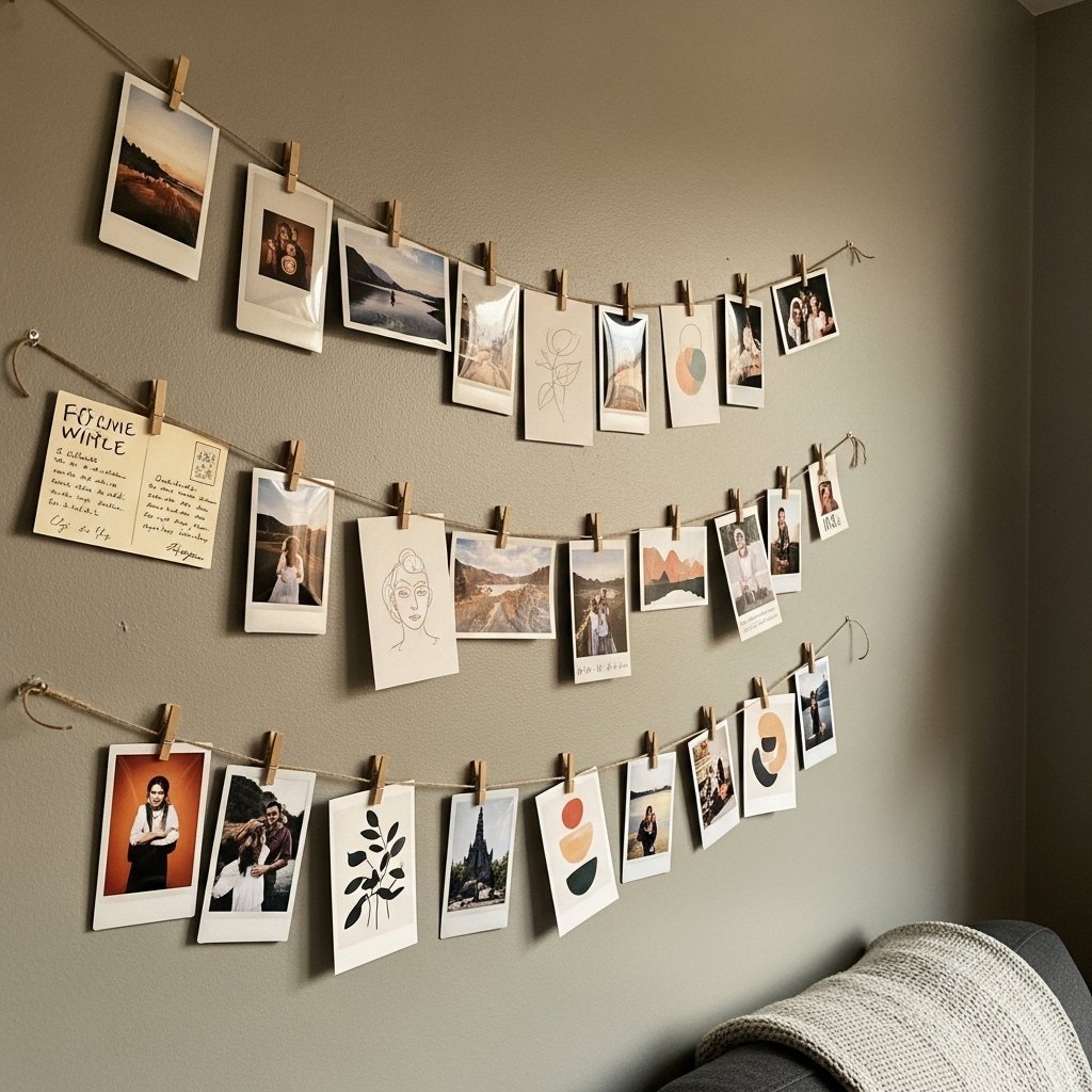 Stringing photos along a piece of twine or wire is a playful and casual DIY wall décor option. Use mini clothespins or clips to hang Polaroids, postcards, or small prints. This flexible design makes it easy to update photos or seasonal décor whenever you want. String displays are perfect above a reading nook, sofa, or side table. They add a cozy, personal vibe while keeping your living room stylish and approachable.