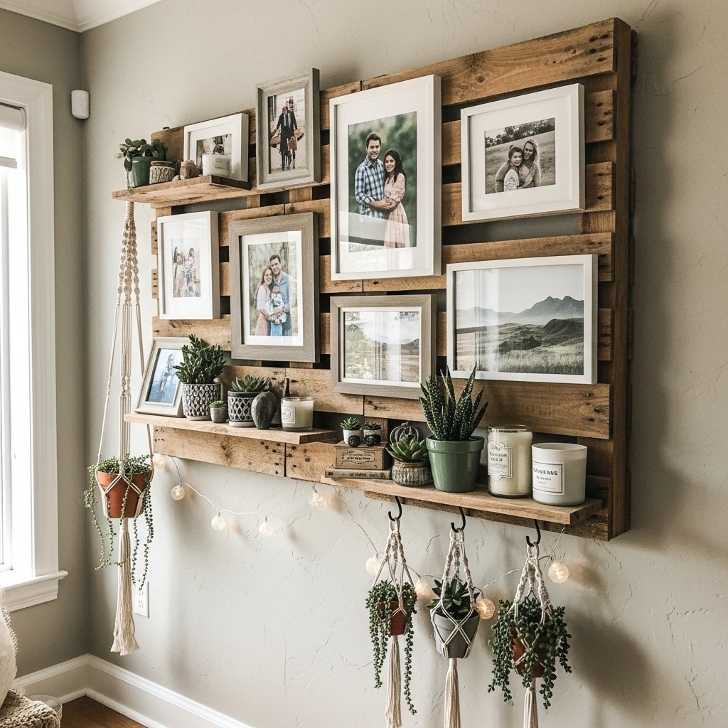 Wooden pallets can be transformed into rustic wall décor for a warm, textured living room display. Sand, paint, or stain the wood, then attach frames, hooks, or small shelves to hold photos, books, or decorative items. This DIY idea combines practicality with a cozy, handmade aesthetic. Pallet art works particularly well in modern farmhouse, industrial, or boho-inspired interiors. It’s a sustainable and creative way to recycle materials while adding character to your walls.