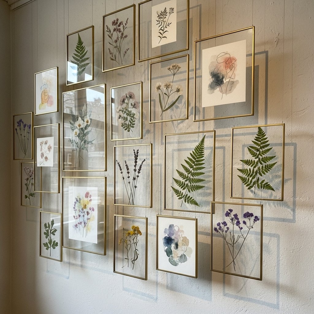 Floating frames create a sense of depth and dimension by suspending artwork or photos between two panes of glass. This type of frame works beautifully for botanical prints, pressed flowers, or delicate sketches. Floating frames are versatile and can be arranged in grids, staggered patterns, or asymmetrical layouts. They bring a contemporary touch to both living rooms and bedrooms. The transparency allows the wall color to show through, adding a subtle layered effect.
