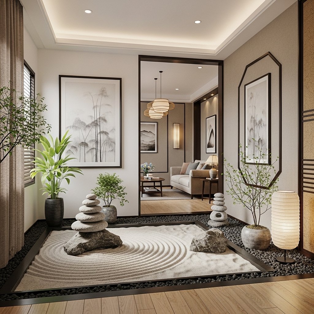 A Zen garden interior is a simple and peaceful style of home decoration inspired by Japanese Zen philosophy. It focuses on calmness, balance, and minimal design using natural elements like stones, sand, bamboo, plants, and soft lighting. The main idea is to create a relaxing space that reduces stress and brings mental peace inside your home.
